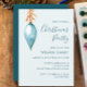 Personalise this invitation template for a unique original art Christmas party invitation. I hand painted this simple blue green teal Christmas bauble. The golden botanical leaves suspend a vintage style holiday ornament on a pale blue background. Modern elegant Merry Christmas script and family name are in teal blue. All the stylish chic text is editable. I hope you enjoy this lovingly made card.