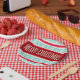 Beautiful paperplates with red/aqua pattern and customisable text.