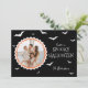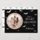 Send your Halloween greeting to your family and friends with Halloween holiday card featuring white bats, texts and unique white frame photo with a touch of orange. Black bat pattern on white background at the back of the card.