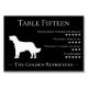 A funny and unique table or team number. Perfect for pet and dog lovers, this black and white monochrome table number is one of a collection of multiple dog breeds. The card reads the table number, followed by The Golden retrievers, and a white outline image of a retriever. As a joke about the guests personalities, four dog traits are listed including friendliness toward strangers, drooling potential, tendency to bark and howl and playfulness, alongside a rating out of five stars. The table card is suitable for a wedding, party, quiz or any other event that requires a team, table or seating plan.