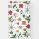 Pretty hand-drawn Christmas doddles illustration, composed of Xmas tree red and golden ball ornaments, Santa with the red hat, green holly leaves and red berries, golden bows, light-up candles, red poinsettia flower, Christmas star, grey and golden bells, stars, and snowflakes, on a solid white background. A seasonal trendy fashion colours Christmas theme, sweet festive winter holidays decor.