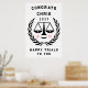 Creative law school graduation party decor featuring congrats, scales of justice cartoon and grad's name. To personalize edit text.