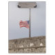 This design features an original photograph showing the flag of the United States of America flying at half-mast. Flying a flag at half-mast is traditionally seen as a symbol of respect, mourning or commemoration. The US flag consists of thirteen equal horizontal stripes of red alternating with white, with a blue rectangle in the canton bearing fifty small, white, five-pointed stars arranged in nine offset horizontal rows; rows of six stars (starting at the top and bottom) alternate with rows of five stars. The 50 stars on the flag represent the 50 states of the United States of America, whereas the 13 stripes represent the thirteen British colonies that declared independence from the Kingdom of Great Britain, becoming the first states in the USA. The flag of the United States of America is sometimes known as the Star-Spangled Banner, Old Glory or the Stars and Stripes.