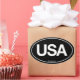 This item has the popular international oval design and abbreviation for the United States; USA.