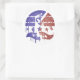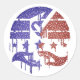 This design features a circular design with striped and colourful shapes, a handshake prominently displayed at the bottom, a ballot shape in the middle with a check mark icon created as negative space, and five arranged stars at the centre.
