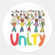 Unity design features a crowd of different stick people standing above the large UNITY lettering. Colorful and warm graphic to show the power and joy in Unity.