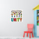 Unity design features a crowd of different stick people standing above the large UNITY lettering. Colourful and warm graphic to show the power and joy in Unity.