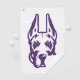 This design is a close-up of the University at Albany Great Dane mascot head. The illustration uses bold purple outlines with detailed shading in grey for the Great Dane's face, highlighting its angular features. The eyes are sharp, and the expression conveys alertness and strength. Accents of gold appear on either side of the dog's jaw, adding a touch of warmth to the otherwise fierce look. The ears are upright and pointed, reinforcing the logo's sense of readiness and authority. The design is minimal yet powerful, ideal for branding UAlbany’s athletic identity.