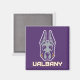 The University at Albany Great Dane mascot logo features a stylised depiction of a Great Dane's head. The dog is illustrated with sharp, bold lines in purple and grey, giving it a fierce, confident expression. The ears stand tall, symbolising alertness and strength. Underneath the Great Dane head is the word "UAlbany" written in bold, blocky golden letters outlined in purple, reinforcing the university's branding. This design represents UAlbany's sports teams, highlighting power, loyalty, and determination.