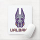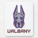 The University at Albany Great Dane mascot logo features a stylised depiction of a Great Dane's head. The dog is illustrated with sharp, bold lines in purple and grey, giving it a fierce, confident expression. The ears stand tall, symbolising alertness and strength. Underneath the Great Dane head is the word "UAlbany" written in bold, blocky golden letters outlined in purple, reinforcing the university's branding. This design represents UAlbany's sports teams, highlighting power, loyalty, and determination.