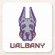 The University at Albany Great Dane mascot logo features a stylised depiction of a Great Dane's head. The dog is illustrated with sharp, bold lines in purple and grey, giving it a fierce, confident expression. The ears stand tall, symbolising alertness and strength. Underneath the Great Dane head is the word "UAlbany" written in bold, blocky golden letters outlined in purple, reinforcing the university's branding. This design represents UAlbany's sports teams, highlighting power, loyalty, and determination.
