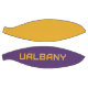 The University at Albany wordmark features bold, geometric typography in purple with gold outlines. The text is written in all capital letters, forming a strong and modern style that emphasizes the university's identity. The angular lines and sharp edges of the font create a sense of power and professionalism. The gold outline adds a touch of prestige and visibility, making the wordmark stand out on both light and dark backgrounds. This design is perfect for branding athletic teams, merchandise, and university-related media.