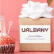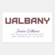 The University at Albany wordmark features bold, geometric typography in purple with gold outlines. The text is written in all capital letters, forming a strong and modern style that emphasizes the university's identity. The angular lines and sharp edges of the font create a sense of power and professionalism. The gold outline adds a touch of prestige and visibility, making the wordmark stand out on both light and dark backgrounds. This design is perfect for branding athletic teams, merchandise, and university-related media.