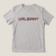 The University at Albany wordmark features bold, geometric typography in purple with gold outlines. The text is written in all capital letters, forming a strong and modern style that emphasizes the university's identity. The angular lines and sharp edges of the font create a sense of power and professionalism. The gold outline adds a touch of prestige and visibility, making the wordmark stand out on both light and dark backgrounds. This design is perfect for branding athletic teams, merchandise, and university-related media.