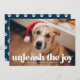 Cute dog-themed holiday card featuring your dog's horizontal photo with "unleash the joy" displayed in bold white lettering. Personalise the dog Christmas card by adding a custom greeting and your name. The card reverses to display a navy and white paw print pattern.