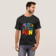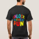 The t-shirt design features the phrase "Unlock the Fun" in a vibrant multicolor display that celebrates the joy of exploration and discovery. Here's a possible breakdown: