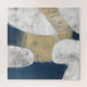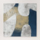 A large abstract shape in navy blue covers the canvas edge to edge with cutouts revealing a textured white background. A worn, textured beige area sits over the blue shape while white lines twist like rope in a dynamic finish to the piece.