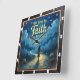A visually rich wall clock depicting a solitary person on a path, moving towards a radiant glow under a celestial sky filled with stars and soft clouds. The powerful message, "we live by faith, not by sight. 2 Corinthians 5:7," is clearly visible. This beautifully framed timepiece symbolises the act of trusting God's plan even when the path ahead is unclear, offering a constant source of encouragement and spiritual reflection.
