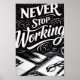 This striking black-and-white magazine-style design captures the essence of dedication and perseverance through its bold typography and clean visual composition. The phrase “Never Stop Working” stands at the centre in an artistic, decorative style, symbolising continuous effort and an unbreakable mindset.