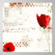 different shades and layers of white, with a splash of bright red design underneath, two big red poppies pop out from the piece with words barley legible in the background
