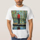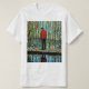 A.I .assisted print of a man in a red coat stands on a path reflected in a body of water adorned with colorful stones, surrounded by a surreal scene of vibrant hanging vines and circular leaves, feeling unwanted by others in his world.