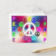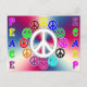 colourful retro look peace card with many coloured smaller peace signs surrounding one larger white one bracketed by the word peace written vertically down and up