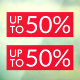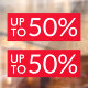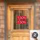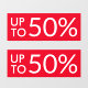 For sale window cling with white text "up to 50%" on red background. You can change the percentage in the template field.