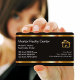 Classy real estate broker business card template presented in a gold metallic looking house symbol and decorative divider line. I designed this business card template for a Realtor, Broker, or real estate agents and agencies and it's presented on our large format card stock taller than standard size for greater impact.