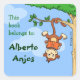 Happy cute monkey hanging upside down by its tail on a tree branch, reading a book. This sweet monkey who loves books is looking forward to decorate your kids books. Customise it with your own desired name. Children Ex libris / bookplate / booklabel
