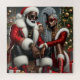 This image features a fashionable Santa and his companion, both exuding style and charisma in modern Christmas attire. Santa is dressed in a sleek, red leather jacket with white fur trim, and his companion complements him perfectly in a glittering red dress. They pose against a backdrop of Christmas decor, bringing a cosmopolitan vibe to the holiday spirit.