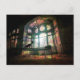Urban decay photo showing huge stained glass windows inside an old church building with the silhouette of a cat playing on an abandoned table.