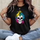 This graffiti-inspired street art design features a white skull with a bright green mohawk. Bright yellow, blue, and pink paint-like splotches form the background. Great for skull or horror lovers and those who enjoy the goth or punk aesthetic.