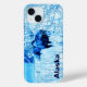 A blue and white image of a cow moose in an urban setting during winter. Customisable text reading, "Alaska" also appears.