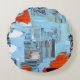 Elevate your modern home decor with this bold abstract art round throw pillow. The dynamic design features thick, textured brushstrokes in a vibrant palette dominated by cool sky blue, light gray, white, and contrasting bright orange-red accents. The impasto-style print creates a sense of movement and depth, reminiscent of a city skyline or an expressionist painting. This unique accent pillow is perfect for adding a sophisticated, contemporary focal point to your living room, office, or bedroom. Abstract expressionist pillow, blue and orange modern cushion, round artistic throw pillow, contemporary home decor.