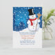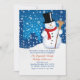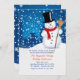 A smiling snowman with a snowy, cityscape background invites you to a winter celebration. Join the fun! Perfect for holiday parties, birthday parties and more.