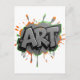 A bold graffiti-style typography artwork bursting with urban energy. The word “ART” explodes from a deep black background in vibrant orange, outlined with neon green accents. Paint splashes and dripping effects add movement and raw street-art attitude, symbolizing creativity without limits. The contrast of sharp lettering and fluid splatters reflects the fearless, expressive nature of modern art culture.