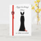A Polish birthday card featuring an evening gown and red stilettos, decorated with red ribbon and a ruby gem.