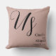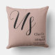 This elegant, romantic keepsake wedding pillow features a dusty pink background. The title "Us" is printed in a large script font at the top, above the married couple's names. The wedding date and location are printed below in a sophisticated, modern, black font.