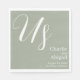 These elegant, romantic wedding napkins feature a dusty sage green background. The title "Us" is printed in a large script font at the top, above the couple's names getting married. The wedding information is printed below in a sophisticated, modern, white font.