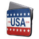 Celebrating the USA's 250th anniversary. This red, white, and blue laptop sleeve has the word 'USA' in the center. The years 1776 and 2026 are next to USA. The top stripe is blue and has white stars. The center stripe is white. The bottom stripe is red with white stars.
