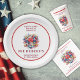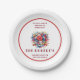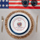 Enhance your table setting with a festive and personalized patriotic plate design. By adding your family name and even customizing the slogan to say, "Welcome to our BBQ," you can tailor it to fit your unique 4th of July celebration. This elegant paper plate design is a perfect tableware for commemorating the birthday of the USA, featuring a beautiful starburst-and-flower bouquet alongside an American flag, making it suitable for any patriotic event. It is part of a curated collection with more items in my store, celebrating America’s 250th birthday, allowing you to fully immerse your gathering in this historic occasion. The Americana style, characterized by vibrant red, white, and blue colors, ensures a visually appealing and festive atmosphere.