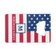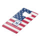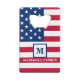 God Bless America. The Land Of The Free. This red, white and blue American flag design can be given as a gift for a 4th of July party, Independence Day celebrations, military graduation, police retirement, family reunion, Memorial Day event, company picnic, wedding, beach house, backyard barbecue or any occasion. The patriotic USA flag monogram design can be personalised with the initial and name of the family, company or retired employee. The design is yours to customise as you wish.