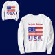 Personalised men's sweatshirt featuring the flag of the United States of America, or, American flag with the letters USA below in the red, white and blue with stars and stripes, found in the flag. Personalise by adding a name for a creative gift or yourself. Cool for 4th of July celebrations and family reunions.