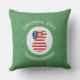 A red haired angel wears the flag of the United States of America on this outdoor pillow for holiday decorating or Christmas decor. The USA Flag Christmas angel is found inside a white circle of squiggly squares. The background is green squiggly squares. Add your own text or personalise with a name and the year.