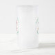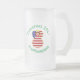 Frosted glass beer mug shows a red haired angel wearing the flag of the United States of America for holiday decorating or Christmas decor. The USA Flag Christmas angel is found surrounded by text allowing you to add your own text or personalise with a name and the year. Lettering is blue.