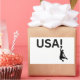 American basketball player using dot of exclamation mark as a ball. Black picture on white background