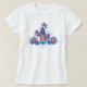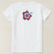 Stars, butterflies and hibiscus frame this graphic with an American flag surfboard spreading the word "Surfing USA". There is a companion print on the back right shoulder of the t-shirt.
