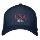 Hat shown in Navy with Red and White embroidered text: USA 2024.