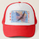 This is a flying eagle over an American flag over a map of the United States including the Hawaiian Islands and Alaska. I wanted to do a patriotic hat. At the top it says, "The United States of America, Indivisible, with Liberty and Justice for All." It's customisable, so the USA and America on the sides can be deleted or replaced with something else.