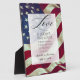 Personalised wedding table plaque with patriotic USA Flag depicts the red, white and blue American flag stars and stripes. It features Christian Bible Verse 1 Corinthians 13:4, "Love is patient, love is kind. It does not envy, it does not boast, it is not proud." Customise with names and date.